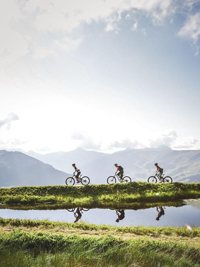 • Drei Mountainbiker auf einem Pfad neben einem spiegelnden Teich vor Alpenkulisse