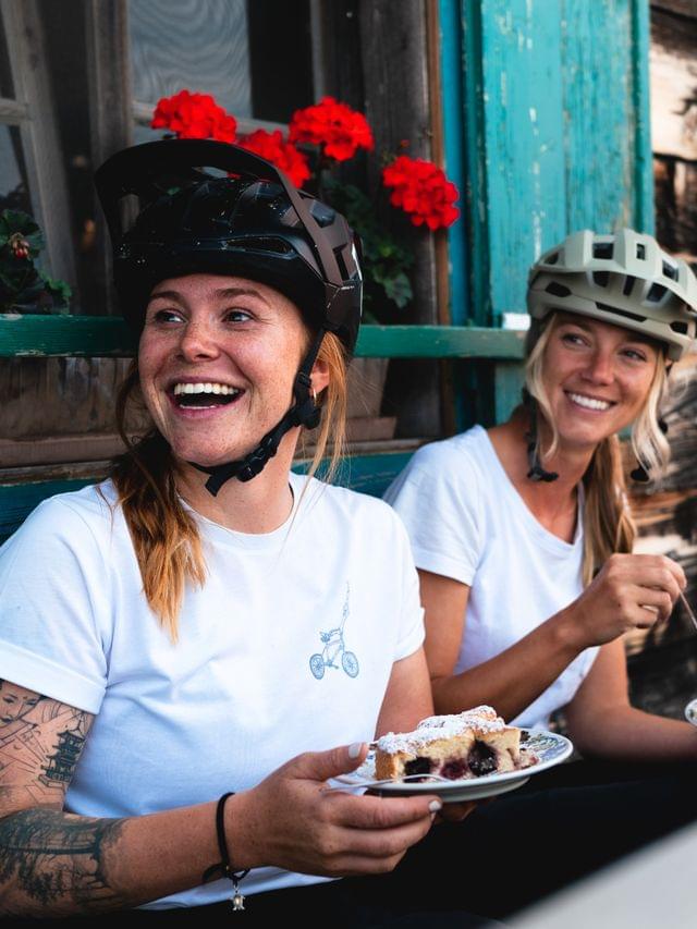 • Zwei Frauen mit Fahrradhelmen genießen Kuchen vor einer rustikalen Berghütte
