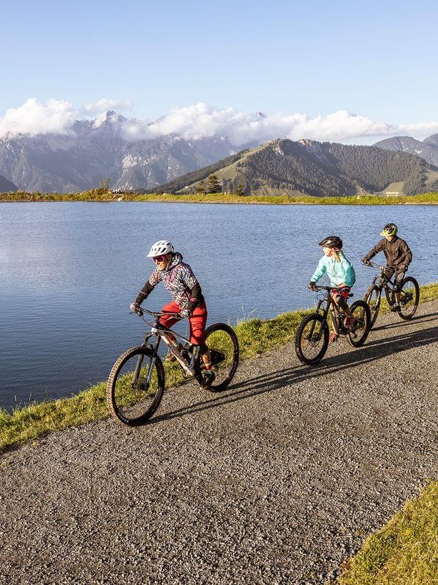 • Familie radelt auf einem Weg am See mit Bergblick im Hintergrund