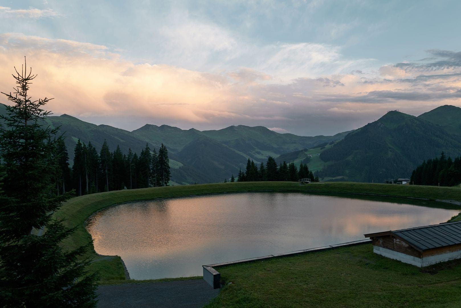 • Bergsee mit Spiegelung des Sonnenuntergangs vor Wald und Alpenhügeln