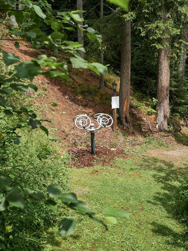 • Outdoor-Fitnessgerät auf Waldweg umgeben von Bäumen und Grün