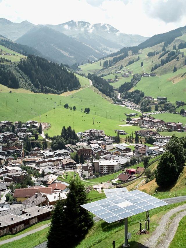 • Alpendorf im grünen Tal mit Solarpaneelen und Skipisten im Hintergrund