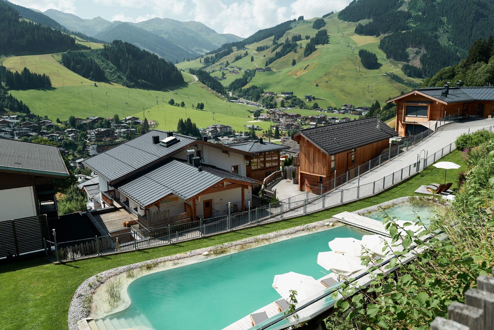 • Luxuriöses Alpendorf mit Pool und Holzhütten mit Blick auf das Bergtal im Sommer