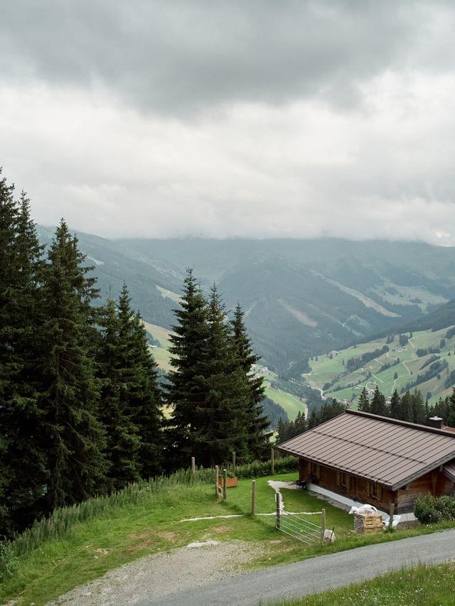 Etwas oberhalb von Hinterglemm liegt das Bachgut – eingebettet in Wiesen, mit weitem Blick ins Tal.