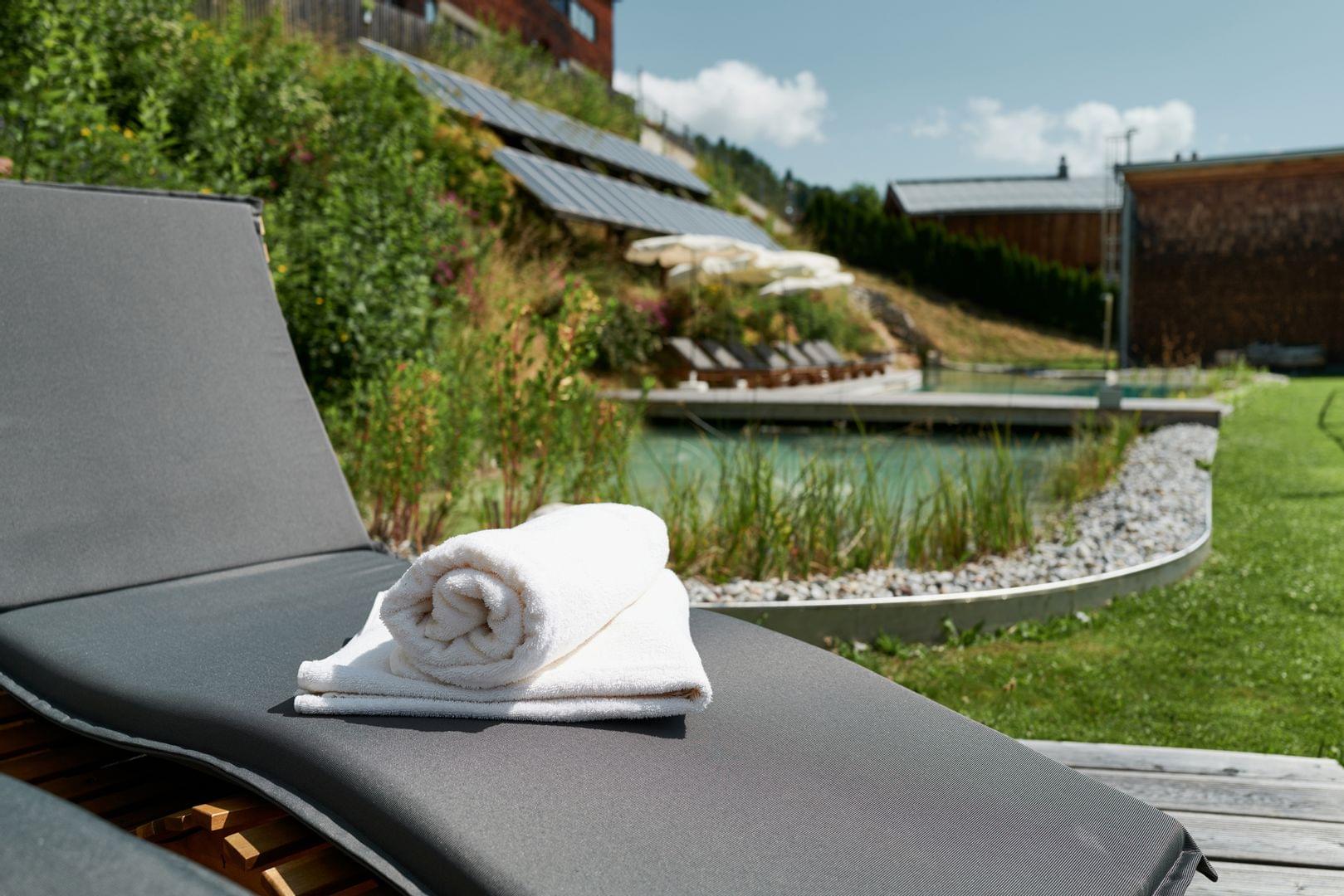 Wellnessliege mit weißem Handtuch neben Naturpool in sonnigem Garten