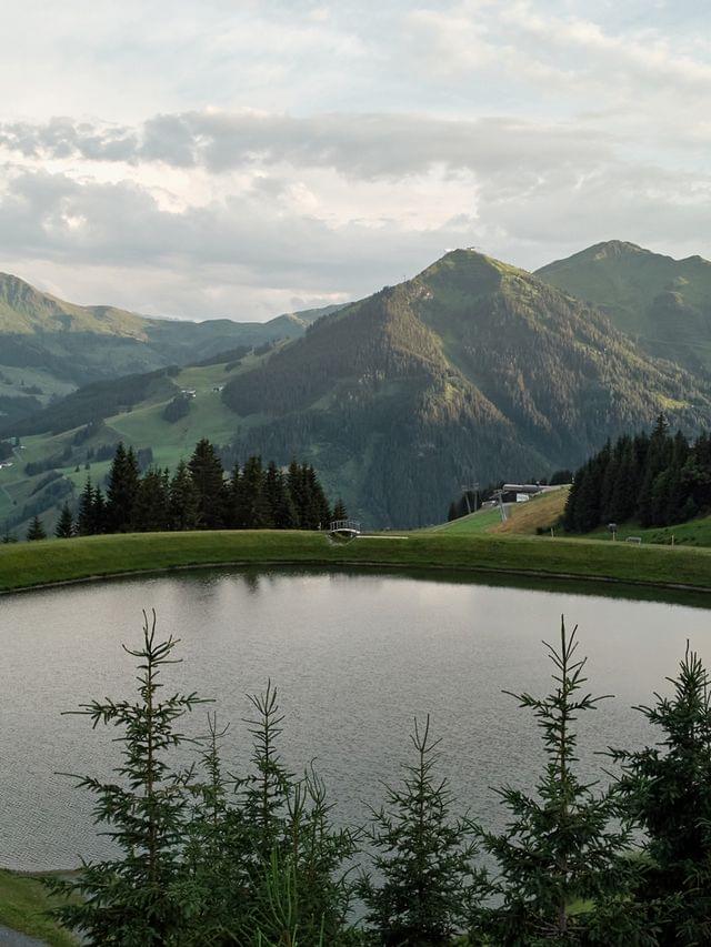 • Bergsee umgeben von Wald und Almwiesen in den österreichischen Alpen
