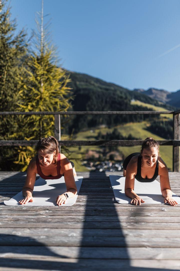 Training unter freiem Himmel ergänzt das Fitnessangebot im Bachgut. Naturnahe Plattformen bieten Raum für Yoga und Workouts, während ein Outdoor-Fitness-Parcours für Abwechslung und neue Herausforderungen sorgt. Die Kombination aus Bewegung, frischer Alpenluft und Bergpanorama schafft ideale Voraussetzungen für aktive Erholung. Großzügige Flächen vor den Almhütten, die weitläufigen Terrassen sowie die Wiesen und Wälder ringsum legen den Grundstein für die eigene Yoga-Auszeit. So macht Fitness in den Bergen noch mehr Spaß.