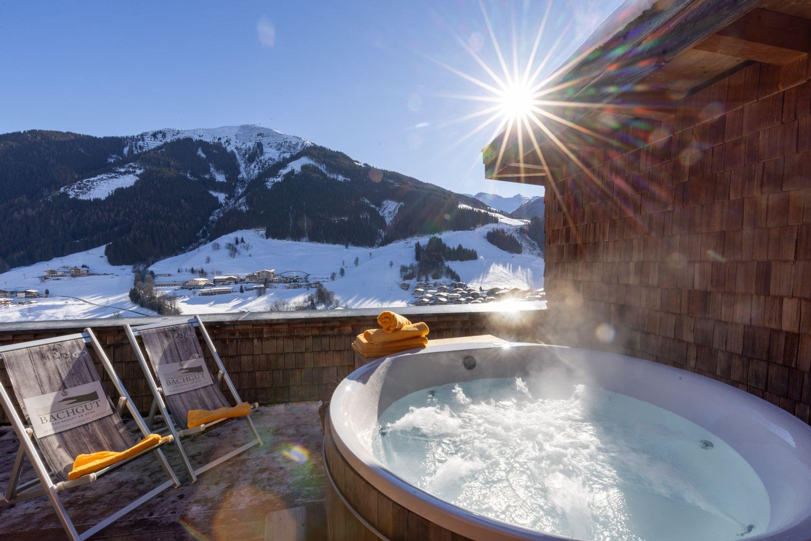Sportlich und aktiv ist eine Sache, aber ein wenig Durchatmen zwischendurch tut so richtig gut. Am Bachgut – Das Resort am Berg ist das kein Problem. Im Skiurlaub für Freude mit Sauna, Außenwanne und Whirlwanne finden alle ihren eigenen Private SPA direkt in der Unterkunft. Wellness ist hier inklusive – und mit dem Badehaus samt Innenbecken und Ruhebereich stellt sich der ultimative Chill-out-Effekt wie von alleine ein.