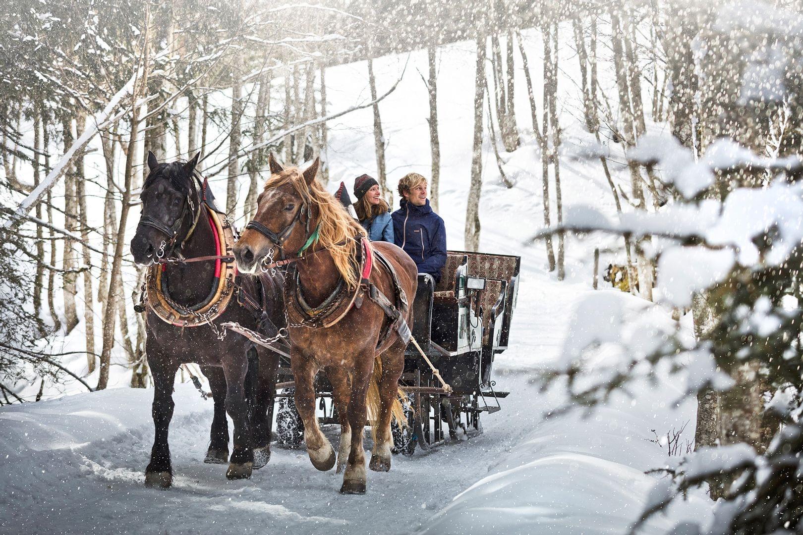 Paar in Winterkleidung sitzt auf Schlitten im verschneiten Alpendorf