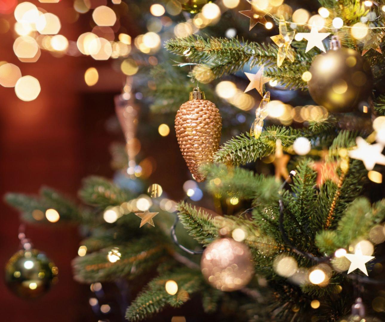 • Weihnachtsbaum mit goldenen Kugeln, Tannenzapfen und Lichterkette geschmückt