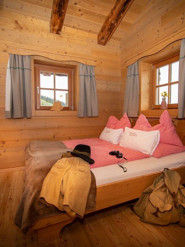 Gemütliches Alpenzimmer mit rotkariertem Bett, Wanderkleidung und Fernglas auf der Matratze