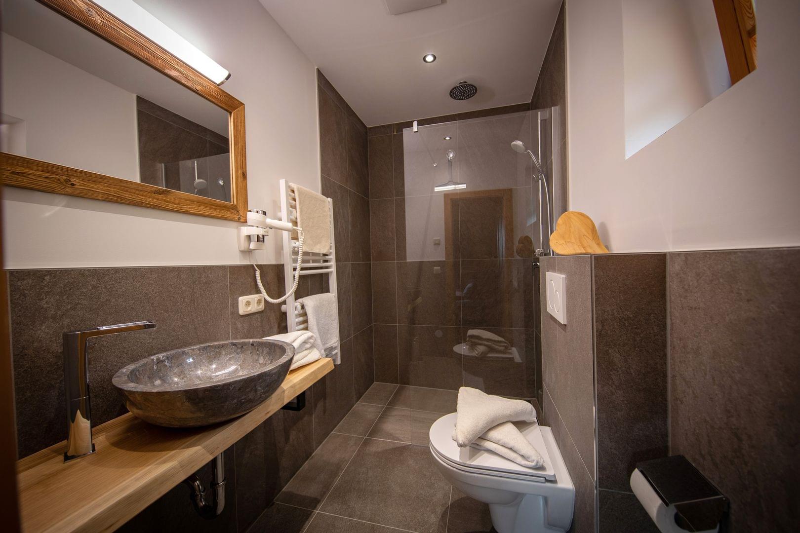 • Modernes Badezimmer mit Steinschüsselwaschbecken, Wandspiegel, begehbarer Dusche und Handtüchern auf der Toilette