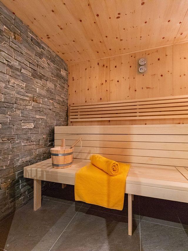 • Moderne Holzsauna mit Steinwand, Bank, Ofen und zusammengerolltem gelben Handtuch