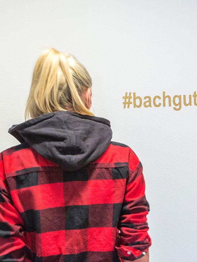 • Frau im rot karierten Hemd steht vor Wand mit Hashtag #bachgut