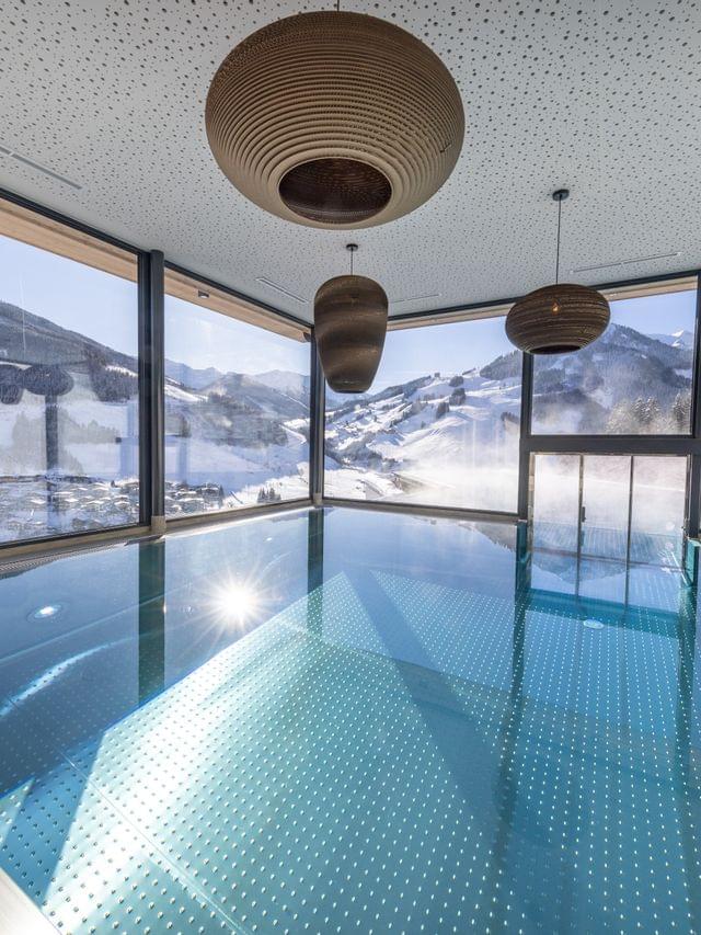 • The Bachgut bathhouse indoor pool with a view of the winter landscape.