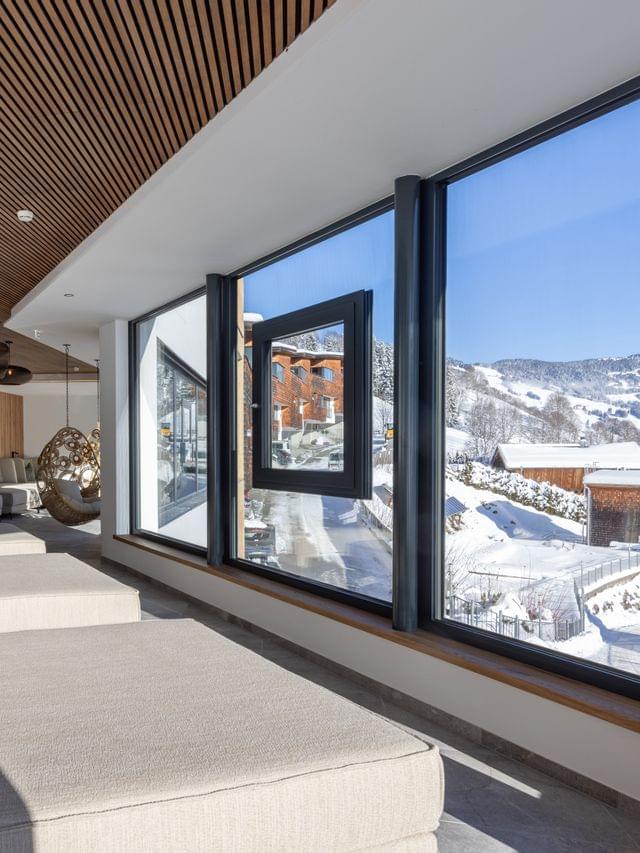 • The bathhouse relaxation room with large loungers and a panoramic window overlooking the winter landscape.