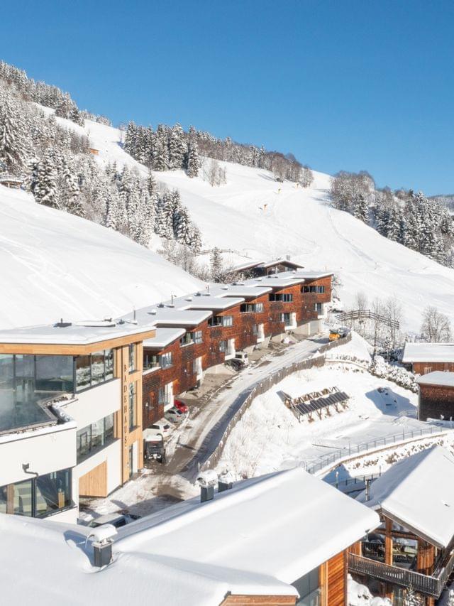 Our main house offers exclusive apartments for particularly cosy holidays. Situated directly by the piste, our Main House Suites are a real ski-in, ski-out highlight for direct access to the Skicircus Saalbach Hinterglemm Leogang Fieberbrunn with its 270 kilometres of pistes. Two apartments, each offering 5 double bedroomsand two further apartments with  3 double rooms and a four-bed room each.
