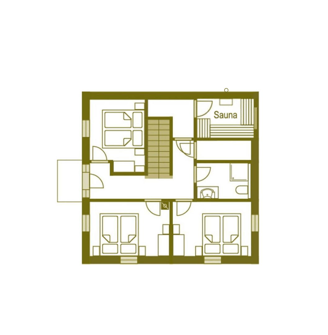 • Second floor house plan layout with three bedrooms, a bathroom, and a sauna