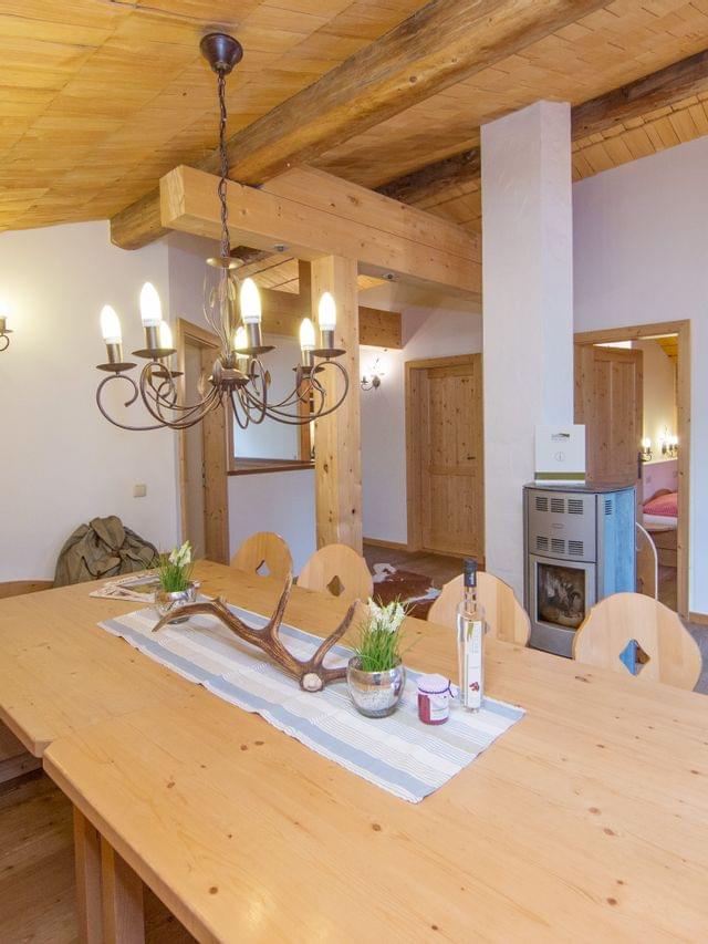 Cozy alpine chalet dining room with wooden furniture, tiled stove and fur rug
