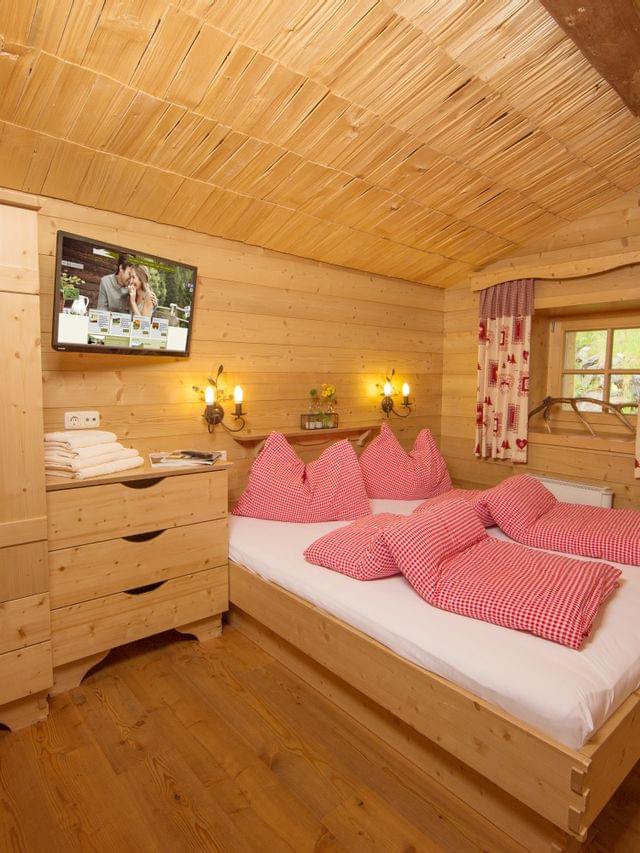 • Cozy alpine bedroom with wooden walls, double bed in red checkered bedding, and rustic decor