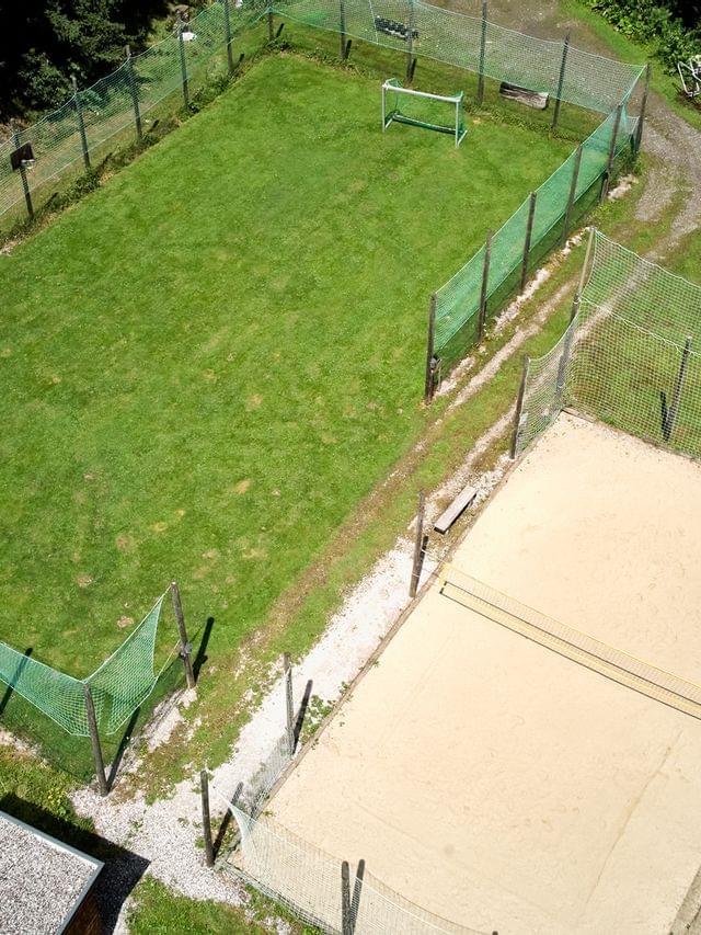 • Aerial view of fenced grass soccer field and sand volleyball court in a forested area
