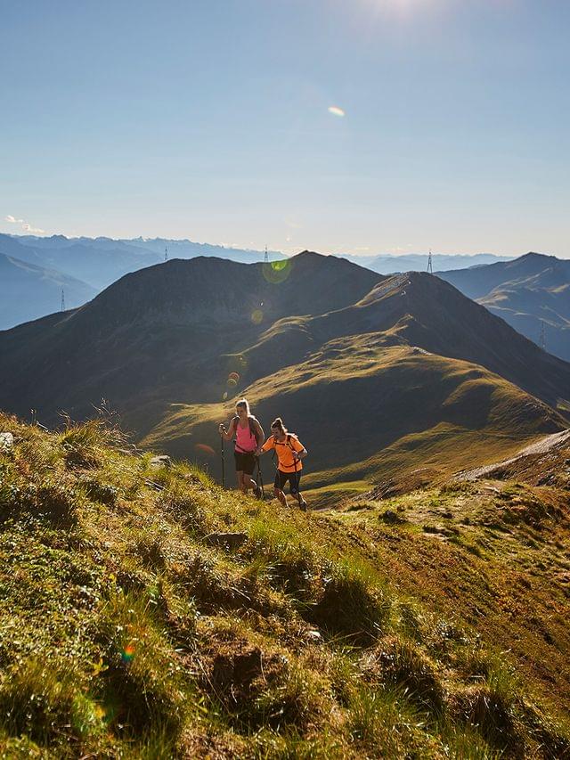 • Two hikers trekking on a sunny mountain trail with panoramic alpine views
