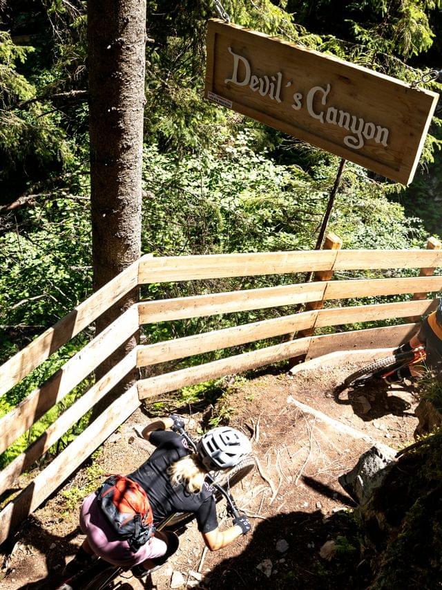 • Mountain bikers riding downhill trail at Devil's Canyon in a dense forest